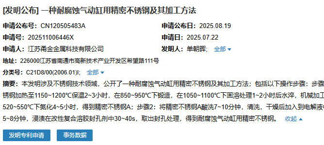 8月19日,江蘇甬金金屬科技有限公司成功申請一項名為“一種耐腐蝕氣動缸用精密不銹鋼及其加工方法”專利,申請公布號為CN120505483A,申請日期為2025年7月22日。
