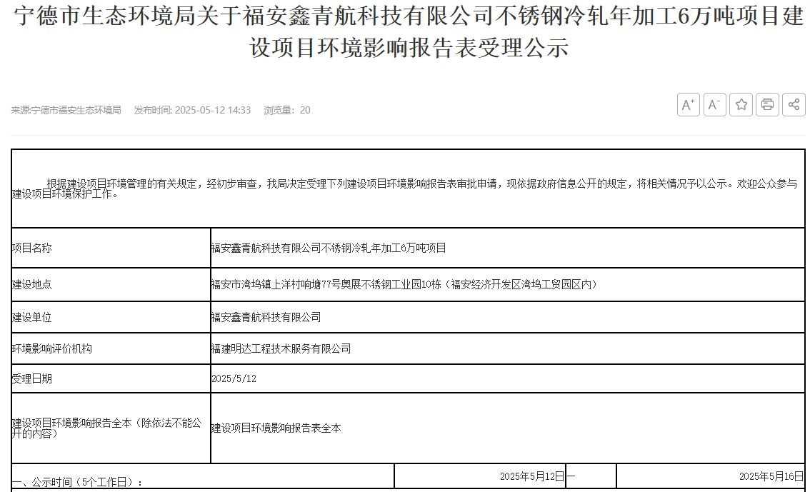 2025年5月12日,寧德市生態(tài)環(huán)境局受理福安鑫青航科技有限公司不銹鋼冷軋年加工6萬(wàn)噸項(xiàng)目建設(shè)項(xiàng)目環(huán)境影響報(bào)告表并對(duì)外進(jìn)行公示,公示期:5個(gè)工作日。