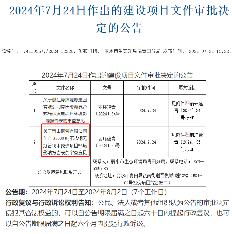 7月24日,麗水市生態環境局青田分局就青山鋼管有限公司年產35000噸不銹鋼無縫管技術改造項目環境影響評價報告表作出審批決定并對外進行公告,公告期:2024年7月24日至2024年8月2日(7個工作日)。