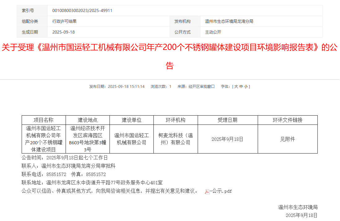 2025年9月18日,溫州市生態(tài)環(huán)境局受理溫州市國運(yùn)輕工機(jī)械有限公司年產(chǎn)200個(gè)不銹鋼罐體建設(shè)項(xiàng)目環(huán)境影響報(bào)告表并對外進(jìn)行公告,公告期:7個(gè)工作日。