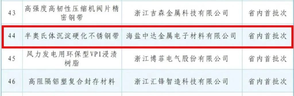 近日,浙江省經信廳公布了2024年度全省首批次新材料認定結果公示。百步經濟開發區海鹽中達金屬電子材料有限公司的半奧氏體沉淀硬化不銹鋼帶榜上有名。