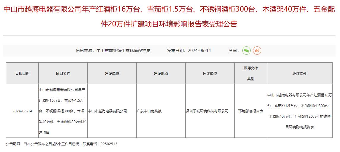 6月14日,中山市南頭鎮(zhèn)生態(tài)環(huán)境保護局受理中山市越海電器有限公司年產(chǎn)紅酒柜16萬臺、雪茄柜1.5萬臺、不銹鋼酒柜300臺、木酒架40萬件、五金配件20萬件擴建項目環(huán)境影響報告表并對外進行公告,公告期:5個工作日。