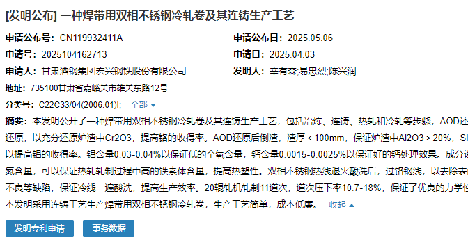 2025年5月6日,甘肅酒鋼集團(tuán)宏興鋼鐵股份有限公司成功申請(qǐng)一項(xiàng)名為“一種焊帶用雙相不銹鋼冷軋卷及其連鑄生產(chǎn)工藝”專利,申請(qǐng)公布號(hào)為CN119932411A,申請(qǐng)日期為2025年4月3日。